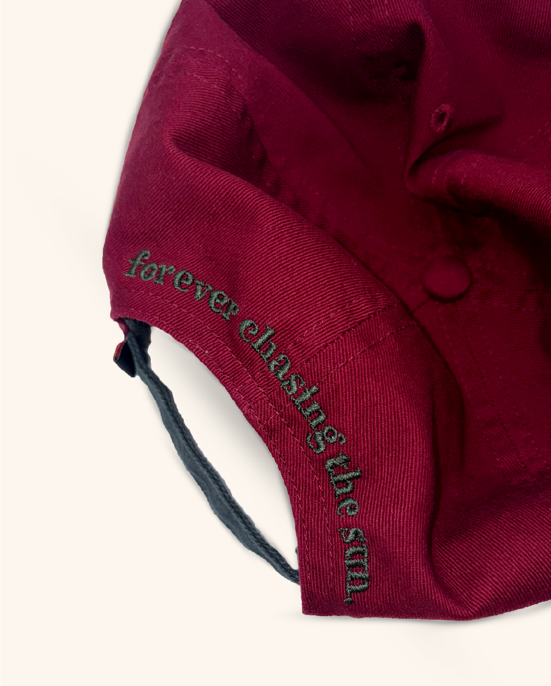 Embroidered with our signature quote, "forever chasing the sun", in green lettering at the back, this cap captures the essence of endless summers. Complete with a self-fabric adjuster at the back with vintage metal sliders and a push button for easy adjustments, it's the perfect accessory for embracing sunny adventures with style and confidence.