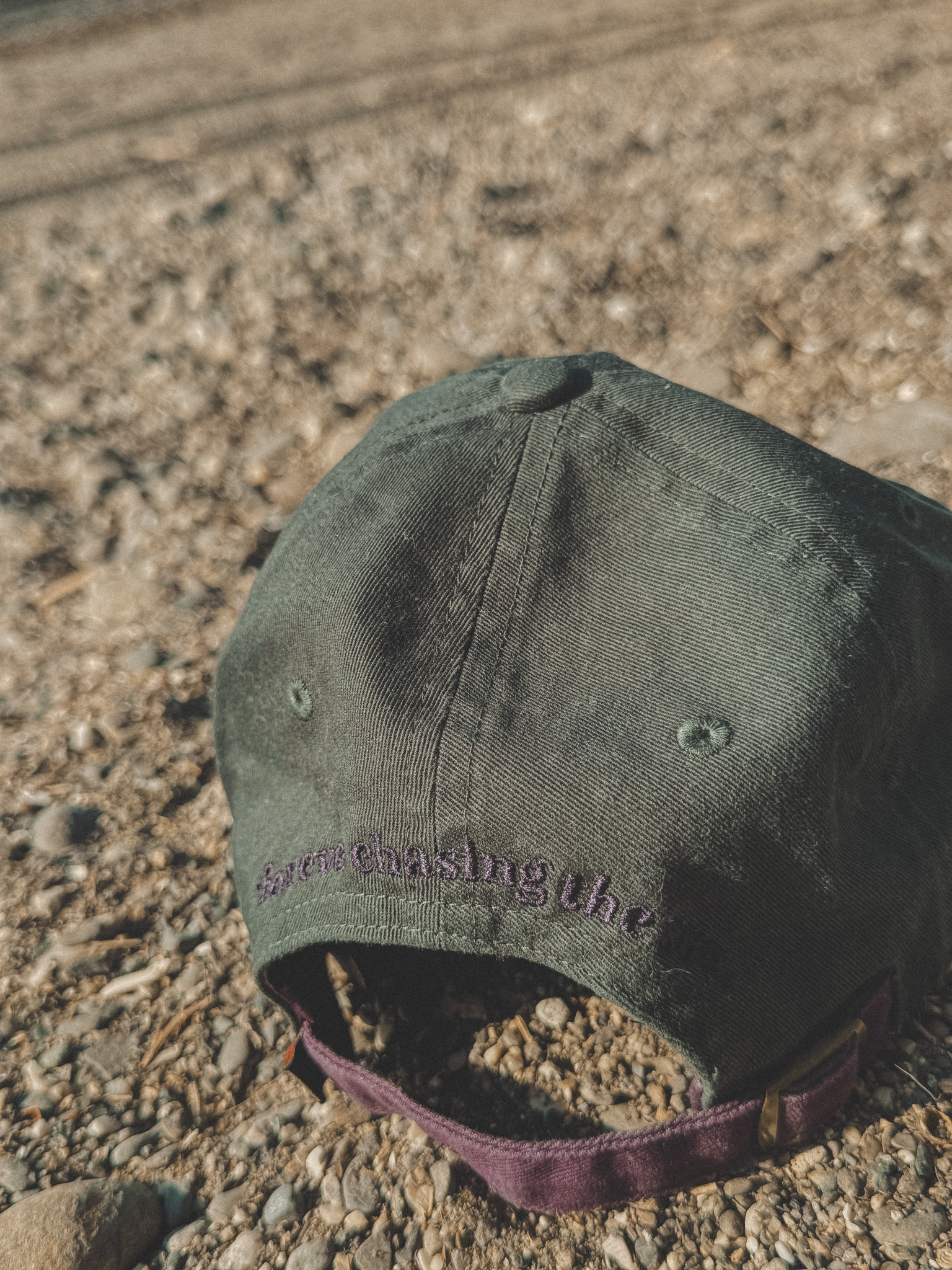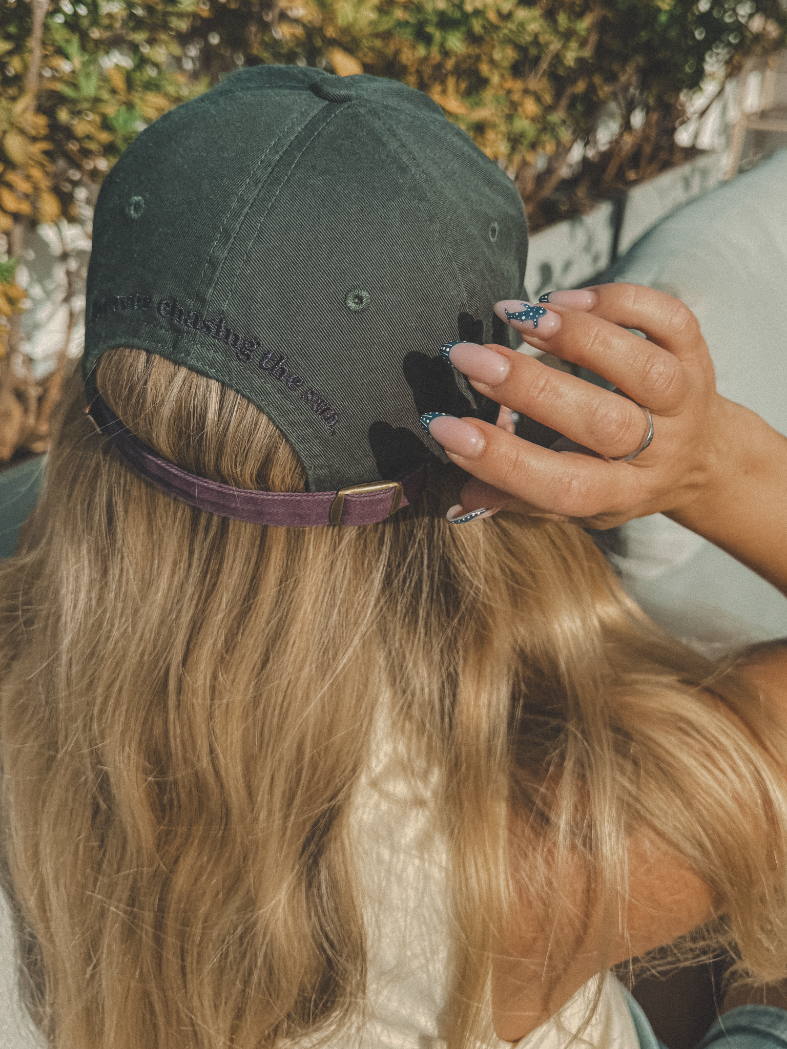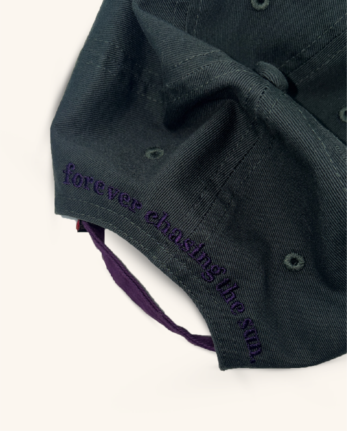 Embroidered with our signature quote, "forever chasing the sun", in purple lettering at the back, this cap captures the essence of endless summers. Complete with a self-fabric adjuster at the back with vintage metal sliders and a push button for easy adjustments, it's the perfect accessory for embracing sunny adventures with style and confidence.